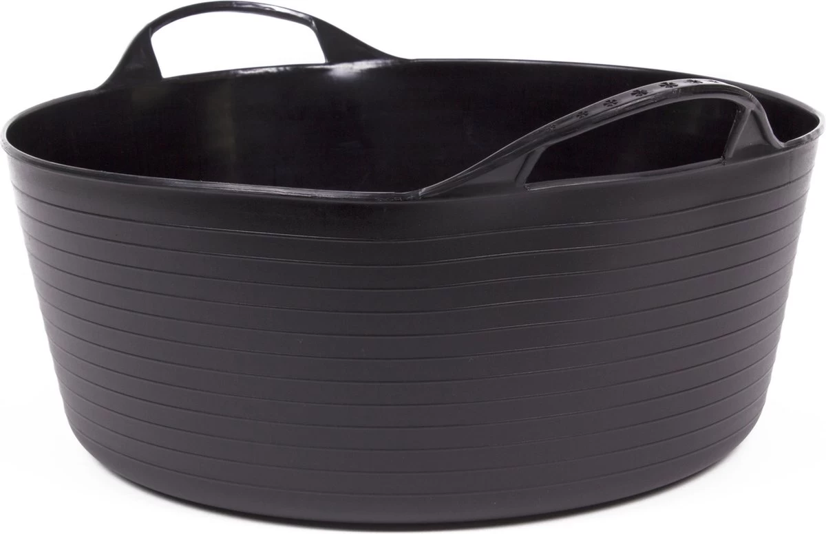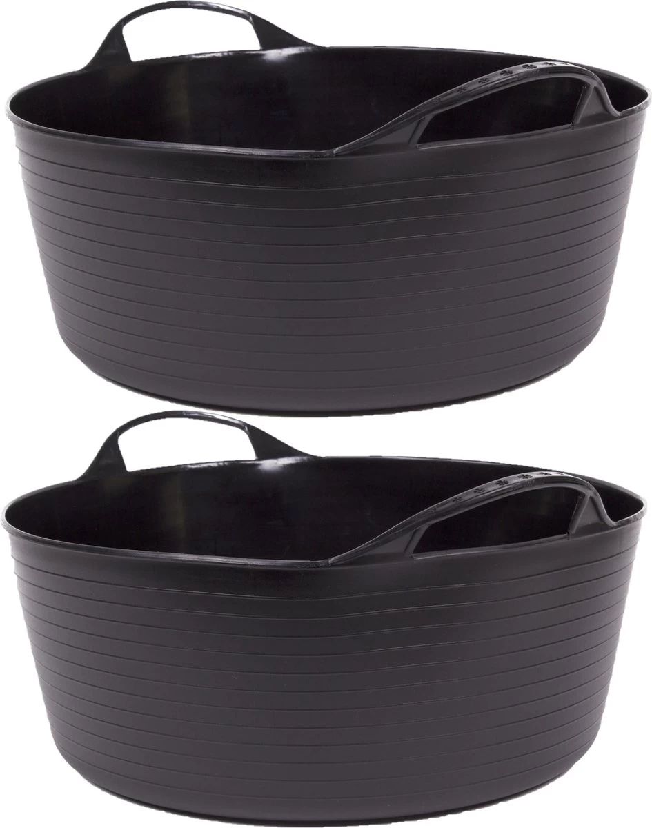 2x stuks flexibele kuip emmers/wasmanden rond zwart 16 liter. Sterke zwarte bak/mand met twee handvatten en een inhoud van 16 liter, gemaakt van flexibel kunststof. Afmetingen: ca. 39 cm in diameter x 20 cm hoog.