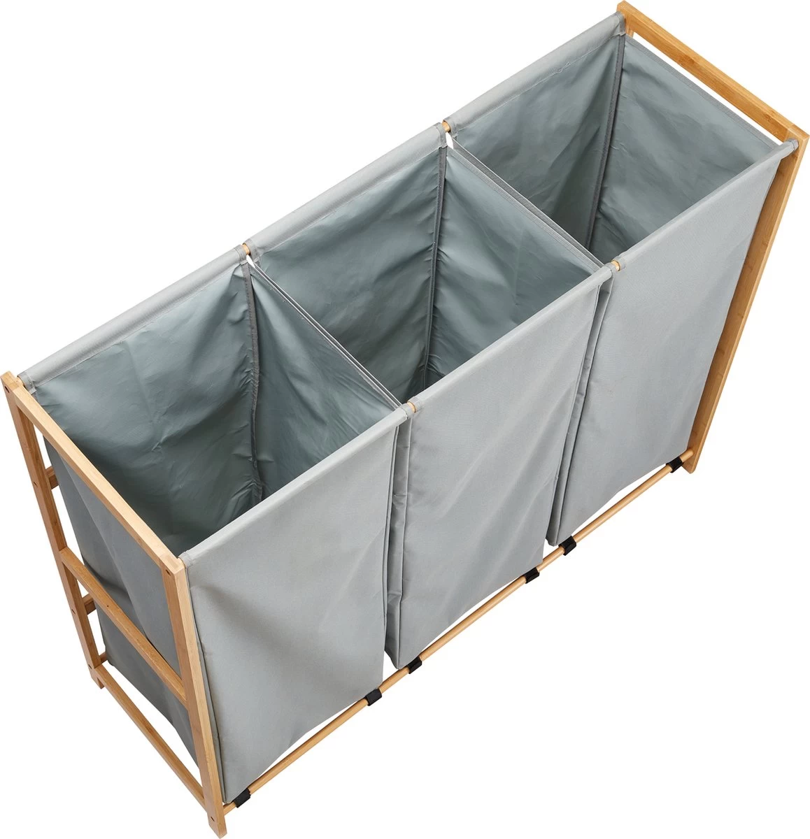 Ultra lichte constructie: De wasmand heeft een houten frame met 3 stoffen zakken zodat je deze gemakkelijk kan optillen.