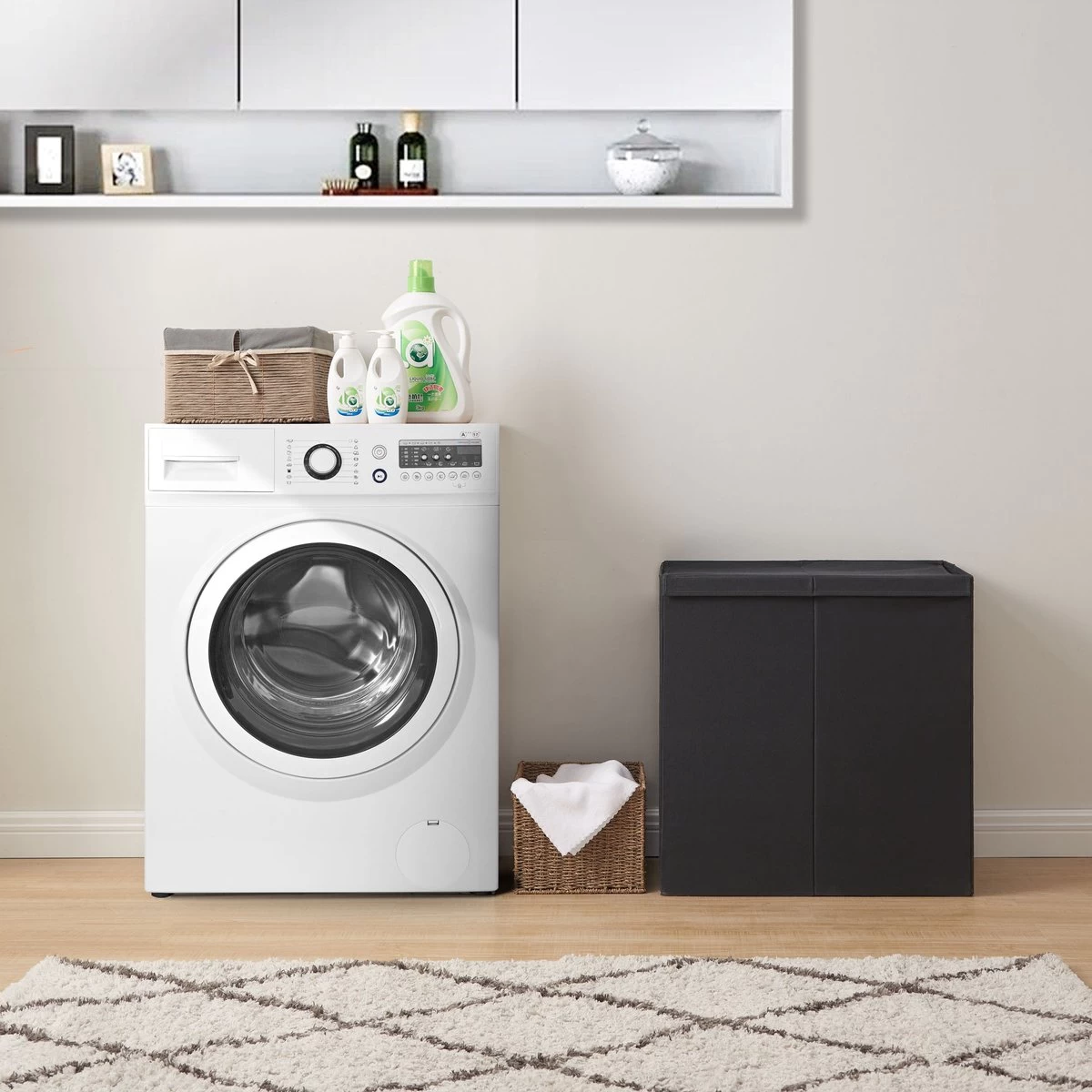 De wasmand is volledig gemaakt uit stof met twee uitneembare zakken zodat je deze gemakkelijk kan optillen door middel van de daarvoor voorziene handvaten. De zwarte kleur geeft de wasmand een neutrale en klassieke uitstraling.