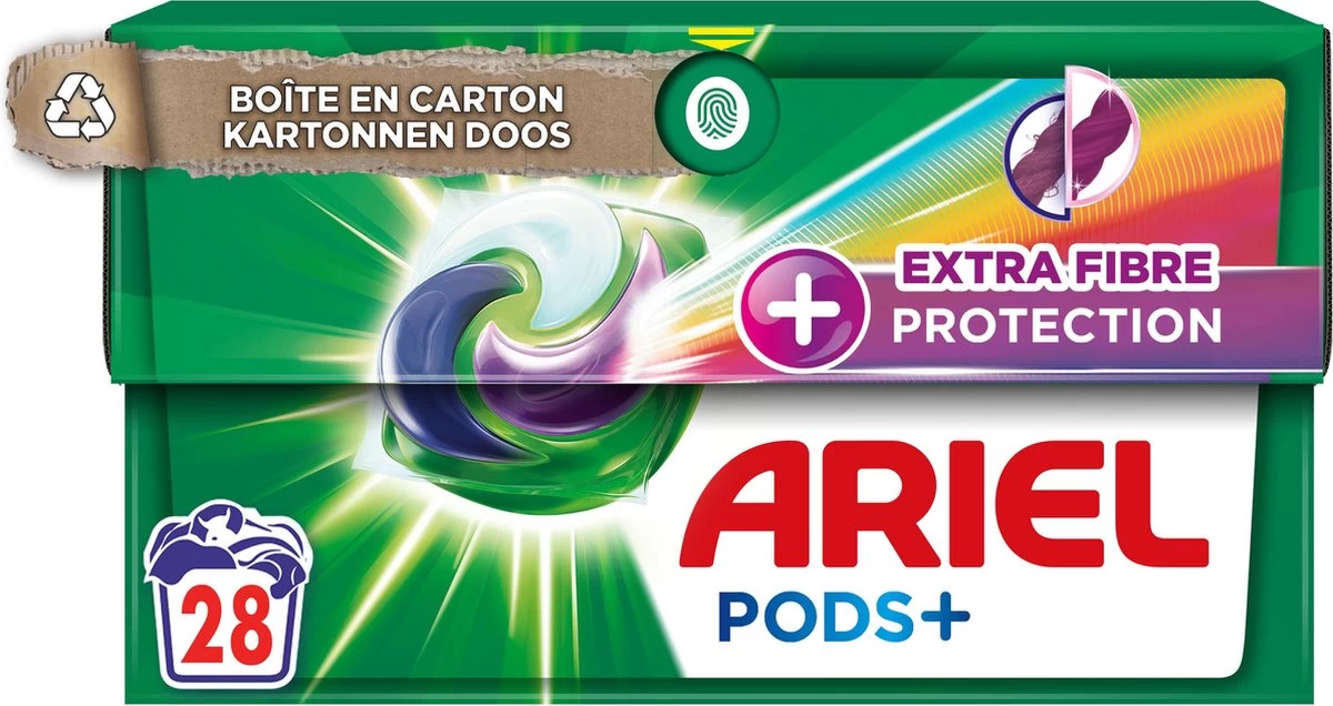 Ontdek Ariel wasmiddel Pods + Extra Vezelbescherming. Ze hebben nu een extra paars vak, vernieuwen de glans van kleuren en beschermen de vezels. Ze zijn gemaakt in Frankrijk en ontworpen voor koud water met de unieke Cool Clean-technologie. Bij contact met water lost het laagje op om krachtige vlekverwijderende technologieën vrij te geven en Ariels diepe en sterke reiniging van All in 1 Pods + Extra vezelbescherming te bieden. Daarnaast kunnen de Ariel wastabletten nu helpen plastic te verminderen dankzij hun recyclebare ECOCLIC-kartonnen doos. Het is gemaakt met 70% gerecyclede vezels en bevat maximaal 5% plastic, ontworpen om je Pods te beschermen.