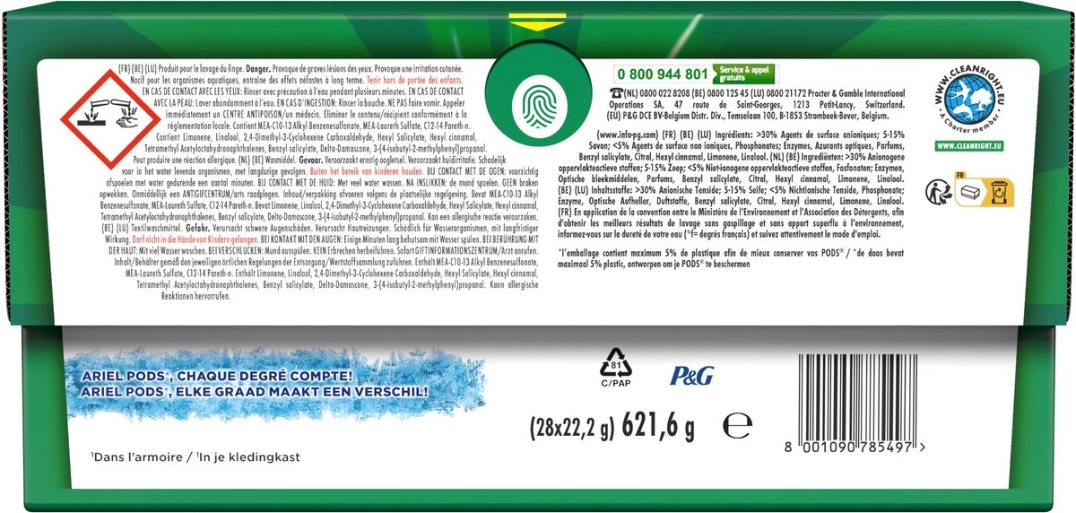- Ontdek ook de Ariel Pods+-collectie met Ultra Vlekkenverwijdering, Actieve Geurbestrijding en Extra Vezelbescherming