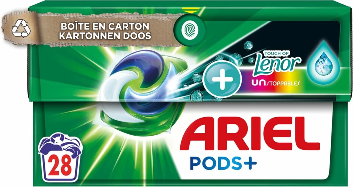Ontdek Ariel Wasmiddel Pods +Touch of Lenor Unstoppables Color. Ze worden nu geleverd met een extra blauw vak en zorgen voor langdurige frisheid tot 1 week (in opslag). Ze zijn gemaakt in Frankrijk en ontworpen voor koud water met de unieke Cool Clean-technologie. Bij contact met water lost het laagje op om krachtige vlekverwijderende technologieën vrij te geven en Ariels diepe en sterke reiniging van Pods+ Touch of Lenor Unstoppables Color te bieden. Daarnaast kunnen de Ariel wastabletten nu helpen plastic te verminderen dankzij hun recyclebare Ecoclic-kartonnen doos. Het is gemaakt met 70% gerecyclede vezels en bevat maximaal 5% plastic, ontworpen om je PODS te beschermen.