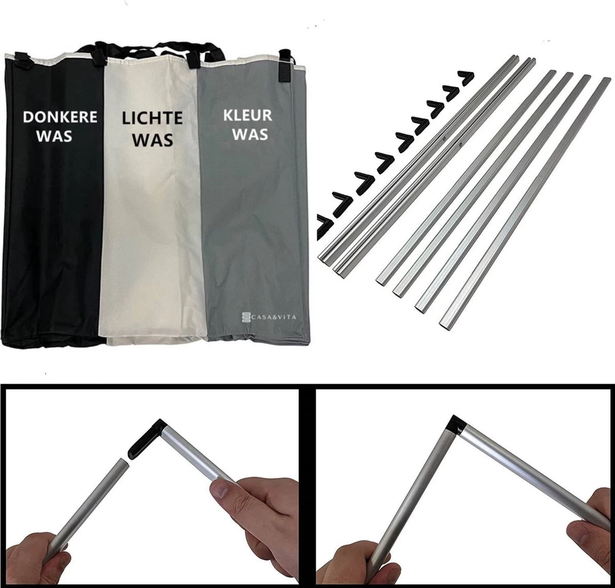 De wasmand is gemakkelijk op te zetten en te demonteren met de bijgeleverde aluminium buizen en bevestigingshoeken. De wasmand zelf wordt bevestigd met klittenband aan het stevige frame, waardoor u ze makkelijk kunt losmaken en opvouwen.