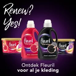 Ontdek Fleuril Renew Black wasmiddel – de ideale verzorging voor donkere en zwarte kleding! Fleuril vloeibaar wasmiddel reinigt zacht om je kleding zo lang mogelijk mooi te houden. Daarnaast hernieuwt het wasmiddel de donkere kleur intensiteit van je kleding en vernieuwt het wasmiddel de vezels, voor een glad en mooi resultaat. Met Fleuril wasmiddel ziet en voelt je kleding geweldig! Fleuril wasmiddel kan gebruikt worden voor zowel koud als heet water en kan ook voor de handwas gebruikt worden.