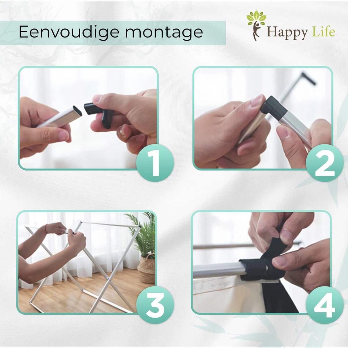 Het aluminium kwaliteitsframe van deze sorteerder is gemakkelijk en vlot in elkaar te zetten. In 5 tot maximaal 10 minuten zet je dit stevig X-frame in elkaar dankzij de duidelijke, gedetailleerde montage instructies die Happy Life meelevert. Volg simpelweg de instructies en de illustraties om de metalen buizen en plastic bevestigingshoeken in elkaar te zetten. De wasmand zelf bevestig je aan het frame met klittenbanden, waardoor je ze telkens weer snel kunt losmaken. Het stevig frame in X-vorm voorkomt dat de wasmand omvalt.
