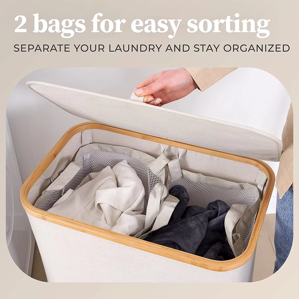 - De tweedelige wasmand met waszak is wasbaar en kan meegewassen worden. Zo blijft je wasmand hygiënisch – nooit meer onaangename geuren in de badkamer.