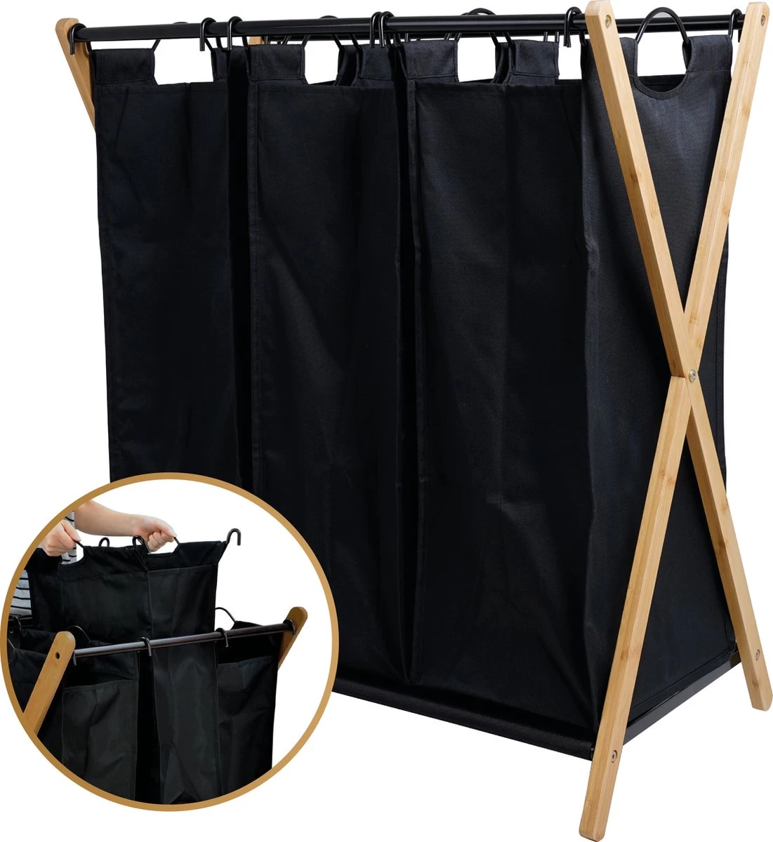 De stijlvolle wasmand met 3 uitneembare vakken van JASC is onmisbaar in elk huis! Ben je het zat om een enkele sok tegen te komen nadat de was al in de wasmachine zit? Wil je niet langer met bergen was door het huis lopen, alleen maar om er achter te komen dat je de helft hebt laten vallen? Dan is deze wasmand de uitkomst! Dankzij het hedendaagse design past deze wasmand thuis in ieder washok of iedere badkamer. De 3 waszakken zijn individueel uitneembaar en zo mee te nemen naar de wasmachine of een slaapkamer. Klaar met de was inladen? Dan hang je de waszak binnen 1 seconden terug in het frame. Erg handig en bespaart tijd!