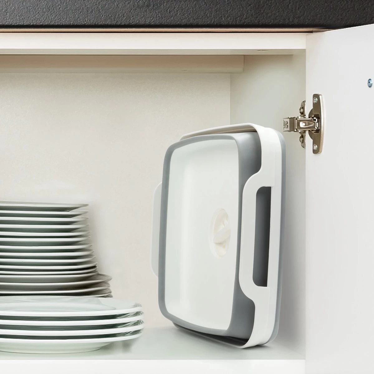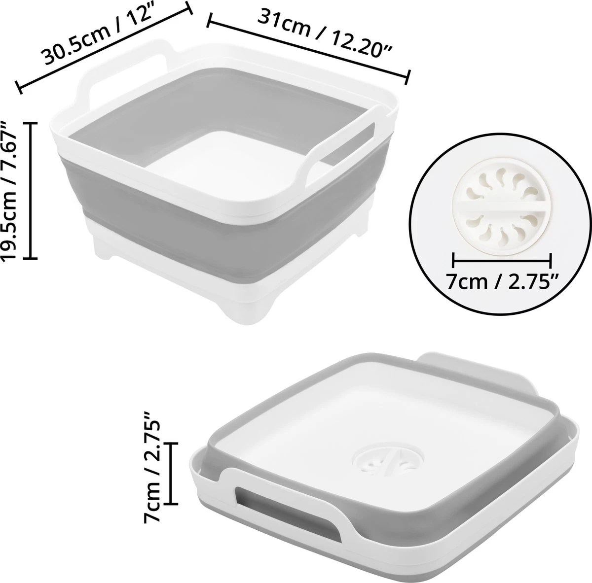 VOUWBARE POP-UP WASBAK: Onze wasbak is wit en grijs in kleur. Het is 30,5 x 31 x 19,5cm wanneer uitgevouwen. Het heeft 2 handvatten en een 7cm drainage gat. De basis, rand en handvat, zijn gemaakt van robuust plastic en de inklapbare zijden zijn gemaakt van siliconen. Het kan tot op 16L koud of heet water houden.;