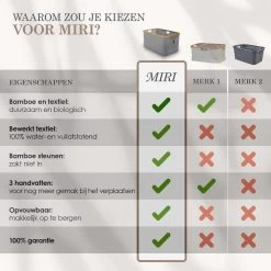 De MIRI wasmand geeft, met zijn 45L inhoud, ruimte aan een complete machinelading natte of droge was. Het textiel waaruit de wasmand bestaat is bewerkt met een speciale coating waardoor deze 100% water- en vuilafstotend is. In het bamboe frame zijn 3 handvatten aangebracht zodat de mand ook gemakkelijk op te pakken en te verplaatsen is met één hand. Deze heupwasmand zorgt voor enorm veel gemak!