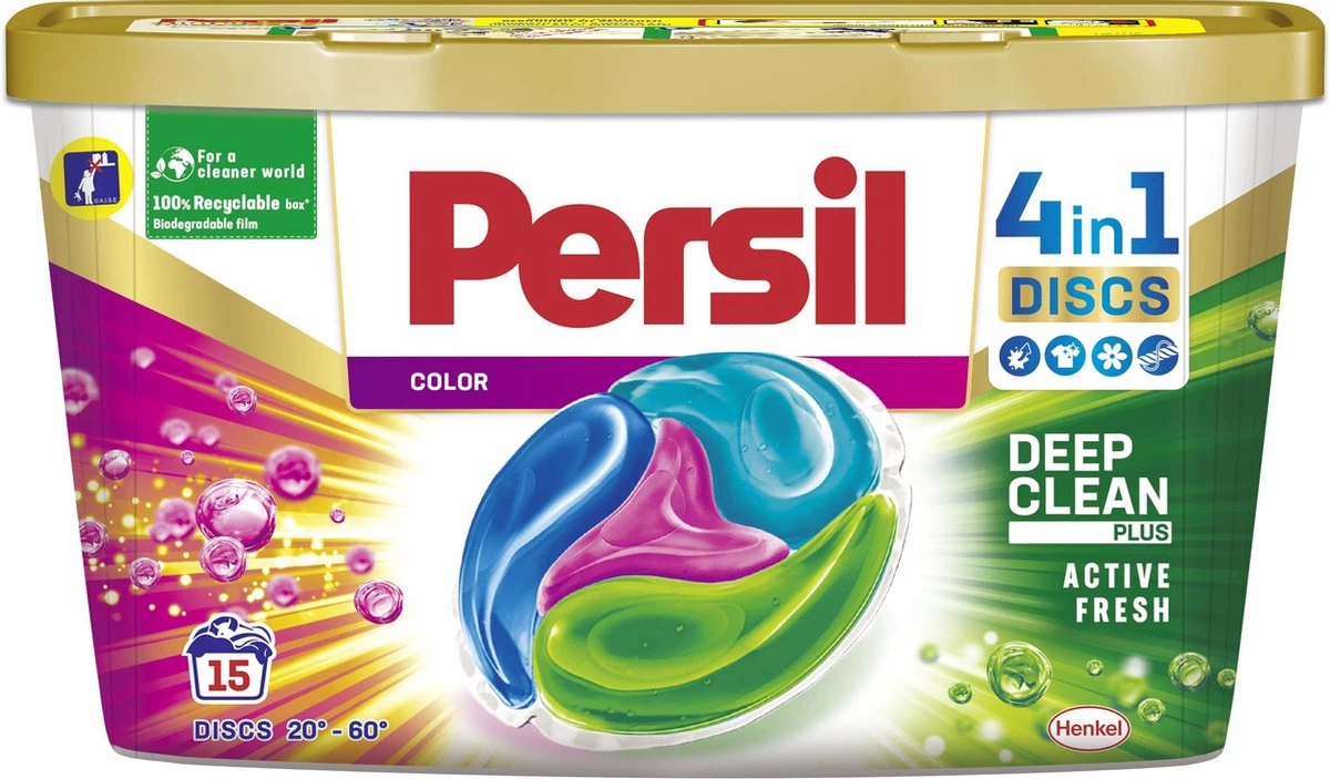 De nieuwe 4in1 Persil Color Discs zijn dƩ wasmiddelcapsules die een perfect schoon en hygiƫnisch wasresultaat garanderen. Ze verwijderen zelfs de meest hardnekkige vlekken, zonder je wasgoed te beschadigen. Elke kamer in de disc heeft een krachtige formule, ontworpen voor vier doeleinden: