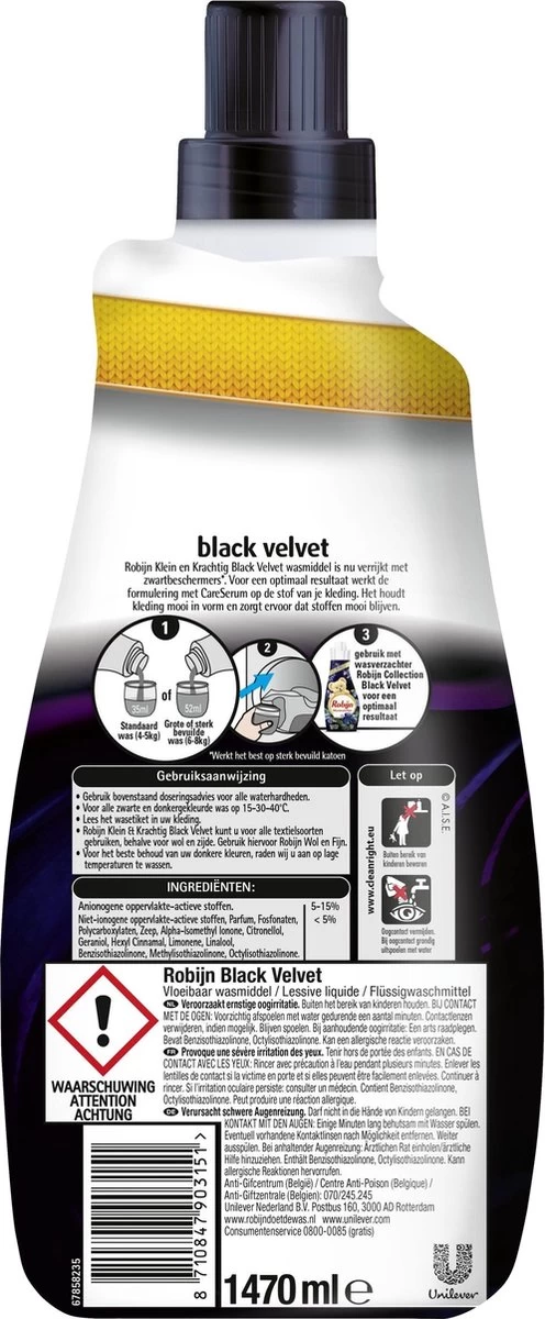Robijn Black Velvet vloeibaar wasmiddel heeft een unieke formule die speciaal is ontwikkeld voor de donkere en zwarte was. Het wasmiddel bevat CareSerum dat ervoor zorgt dat je favoriete kleding lang mooi blijft. Het houdt namelijk kleding in vorm, stoffen mooi van kleur en de stof mooi. Het wasmiddel bevat bovendien een heerlijk frisse geur en is goed voor 42 wasbeurten per fles. Robijn Black Velvet wasverzachter is een perfecte geurmatch met Robijn Black Velvet vloeibaar wasmiddel. Laten we proberen meer te genieten in een wereld die maar doorraast en soms aan je voorbij vliegt. Juist van kleine dingen, zoals de geuren en kleuren die je in het dagelijks leven tegenkomt. Met Robijn kun je van dit soort momenten genieten. Om ervoor te zorgen dat je altijd in geuren en kleuren kunt genieten, steekt Robijn veel zorg en aandacht in het ontwikkelen van de producten. Wasverzachters met heerlijke geuren, en wasmiddelen die kleuren lang mooi houden. Daarmee brengt Robijn deze genietmomentjes ook binnenshuis tot leven: tijdens het aantrekken van pas gewassen jeans of als je tussen de lakens stapt, gewassen met heerlijk ruikend wasmiddel en wasverzachter. Robijn heeft wasmiddelen voor bonte en gekleurde was, maar ook voor donkere, witte en fijne was. Combineer met de bijbehorende wasverzachter om zo lang mogelijk te genieten van alle stralende kleuren en heerlijke geuren in je kast. Het motto van Robijn is al jaren “Wat mooi is, moet mooi blijven”. Met wasmiddelen en wasverzachters van Robijn zorg je dat je kleding langer als nieuw blijft, en bovendien heerlijk ruikt. Let op: voor het meest frisse resultaat stop je de machine niet te vol.
