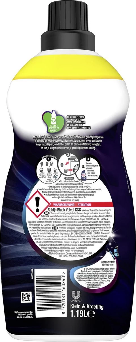 Robijn Klein & Krachtig Classics Black Velvet Vloeibaar Wasmiddel bevat 80% biologisch afbreekbare ingrediënten en is speciaal ontwikkeld voor de donkere en zwarte was.