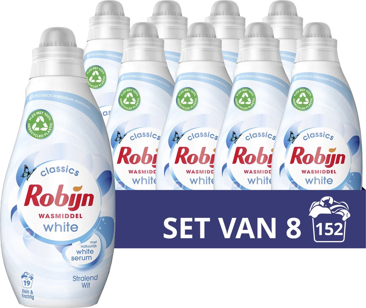 De verbeterde Robijn Stralend Wit formule bevat 80% biologisch afbreekbare ingrediënten. We zijn op weg naar volledig biologisch afbreekbare formules. De vertrouwde effectiviteit en bekende geuren van Robijn, gecombineerd met de kracht van de natuur. Goed voor je kleding en beter voor de planeet. Bovendien zijn de flessen gemaakt van 100% gerecycled en 100% recyclebaar plastic. Op deze manier draagt Robijn bij aan een duurzamere manier van wassen.