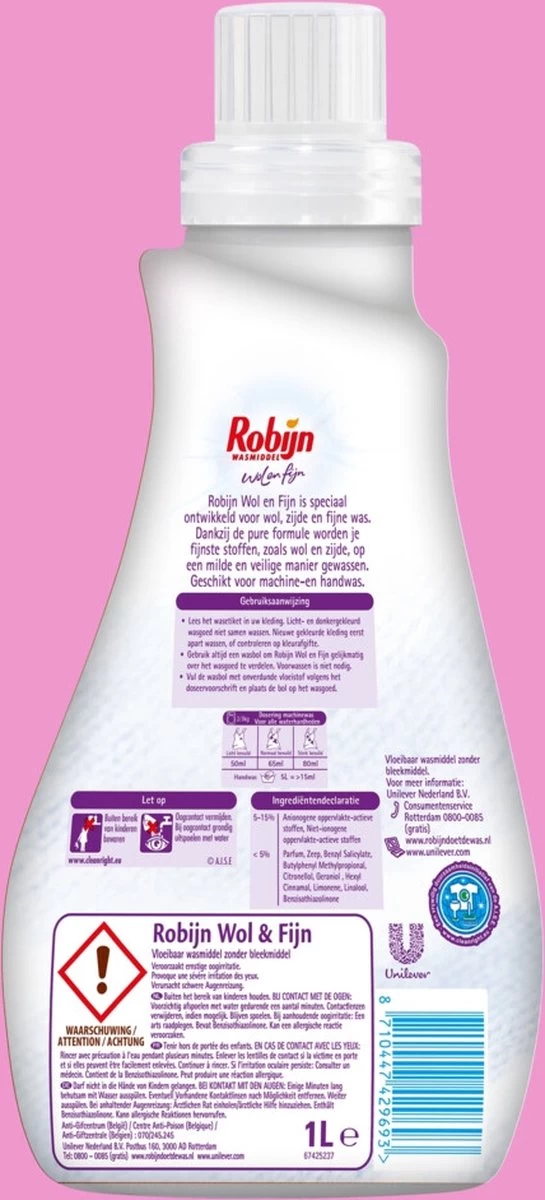 - Goed voor 20 wasbeurten per fles Robijn Wol en Fijn wasmiddel