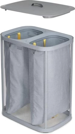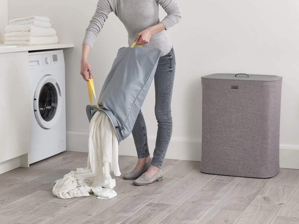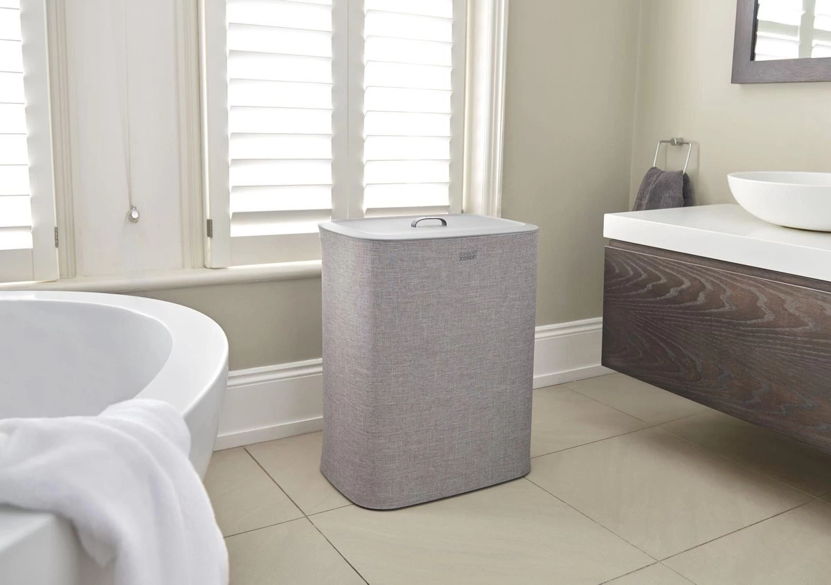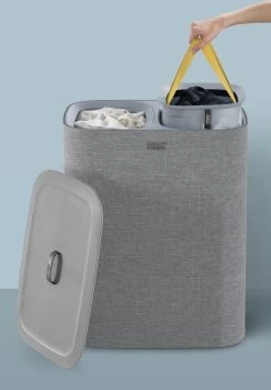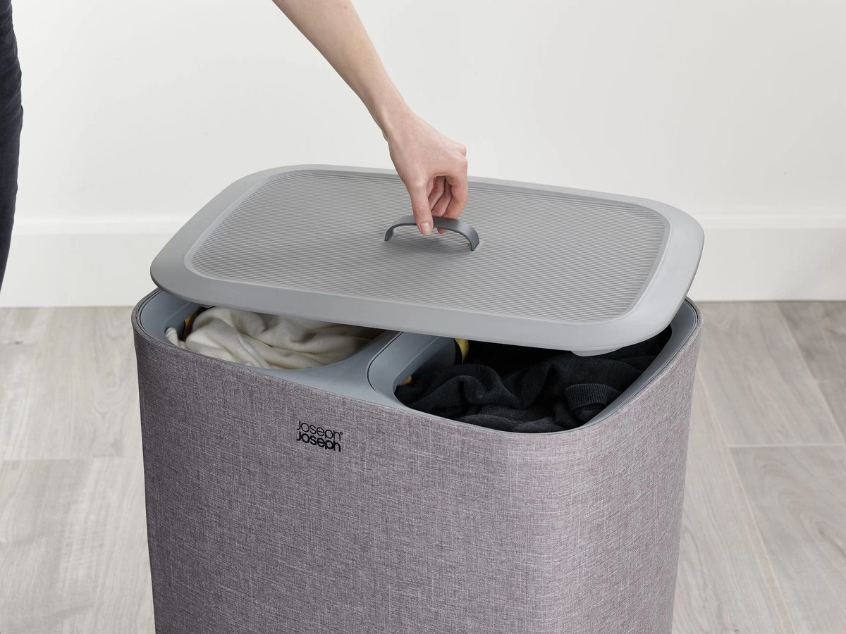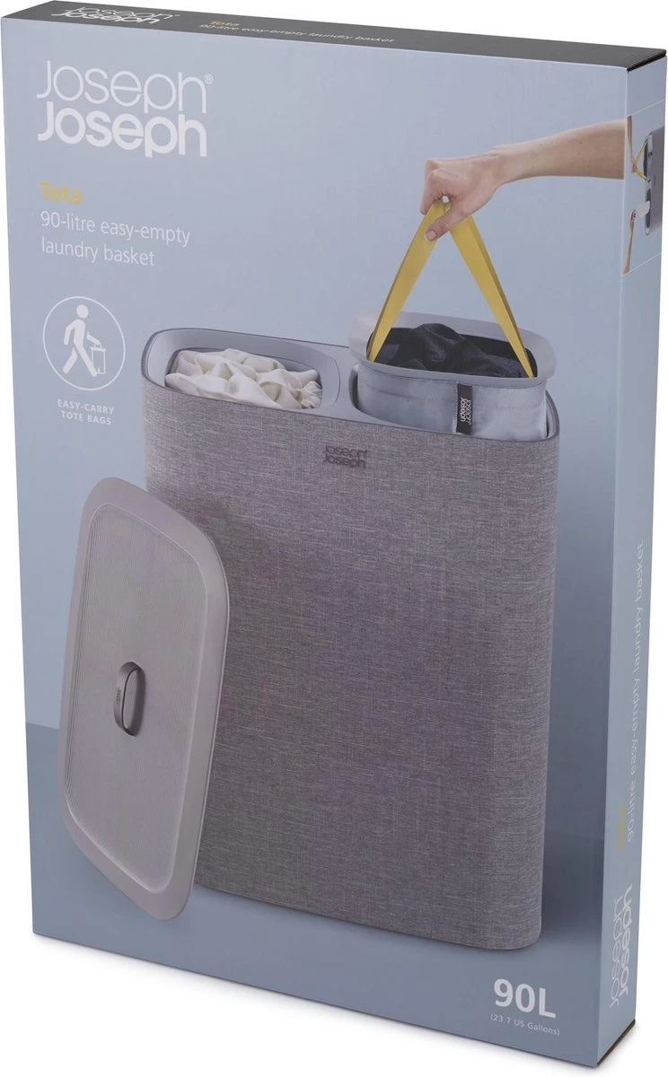 Het sorteren van wasgoed is nog nooit zo makkelijk geweest met deze slimme Tota wasmand van Joseph Joseph. Dankzij de praktische snufjes is de wasdag voortaan een minder grote klus. De wasmand is voorzien van een deksel waaronder je 2 verschillende stoffen tassen vind welke gebruikt kunnen worden om licht en donker wasgoed te kunnen scheiden. Iedere tas is voorzien van handvatten waardoor je hem makkelijk vanuit de wasmand naar de wasmachine kunt tillen. De lus aan de onderzijde helpt je vervolgens om de tas makkelijk te legen. Hierna kan de tas eenvoudig, zonder lussen of knopen, in de wasmand worden teruggeplaatst dankzij de zelf lokaliserende rand zodat hij perfect op zijn plaats valt. Het stijlvolle ontwerp maakt deze wasmand ideaal om te combineren met andere stijlen in huis waardoor hij niet misstaat in zowel de badkamer, slaapkamer of het washok. Deze wasmand heeft een inhoud van 90 Liter en is ook verkrijgbaar in een 60 Liter variant. Hij wordt plat geleverd inclusief montage instructies.