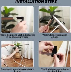 Het frame is eenvoudig te monteren. Deze wasmand wordt geleverd met alle benodigde schroeven, bouten en moeren en zelfs een schroevendraaier, zodat je zelf niks nodig hebt